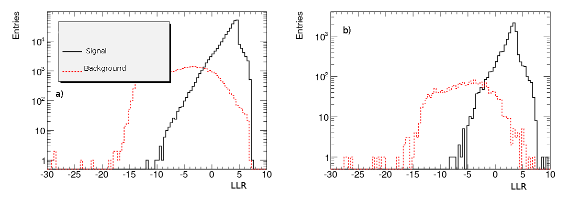A Log-Likelihood Ratio (LLR) is used to separate signal from background. The distributions of the identified discriminating variables for signal and background are normalised to unity separately to obtain probability distribution functions (PDF). Using these the joint likelihoods \( L_{s} = \prod_{i} P^{i}_{s}(x_{j}) \) and \( L_{b} = \prod_{i} P^{i}_{b}(x_{j}) \) are constructed where \( P^{i}_{s}(x_{j}) \) and \( P^{i}_{b}(x_{j}) \) are the probabilities of the ith discriminating variable to have a value \( x_{j} \) in signal and background events respectively. The LLR is then defined as in Eqn. \eqref{eqn_LikelihoodRatio} $$ \begin{equation} LLR = log(\frac{L_{s}}{L_{b}}) \label{eqn_LikelihoodRatio} \end{equation} $$ 70 \( \% \) of the data in the \( \ztoee \) sample and in the real data sample were used for establishing the LLR cut. The likelihood ratios for these \( \ztoee \) and data samples for signal and background trig-electrons are shown in Figure 1 respectively.
