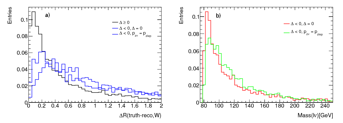 Figure 2: a) \( \Delta \) R between truth and reconstructed leptonic W and b) mass of reconsructed lepton+neutrino system.