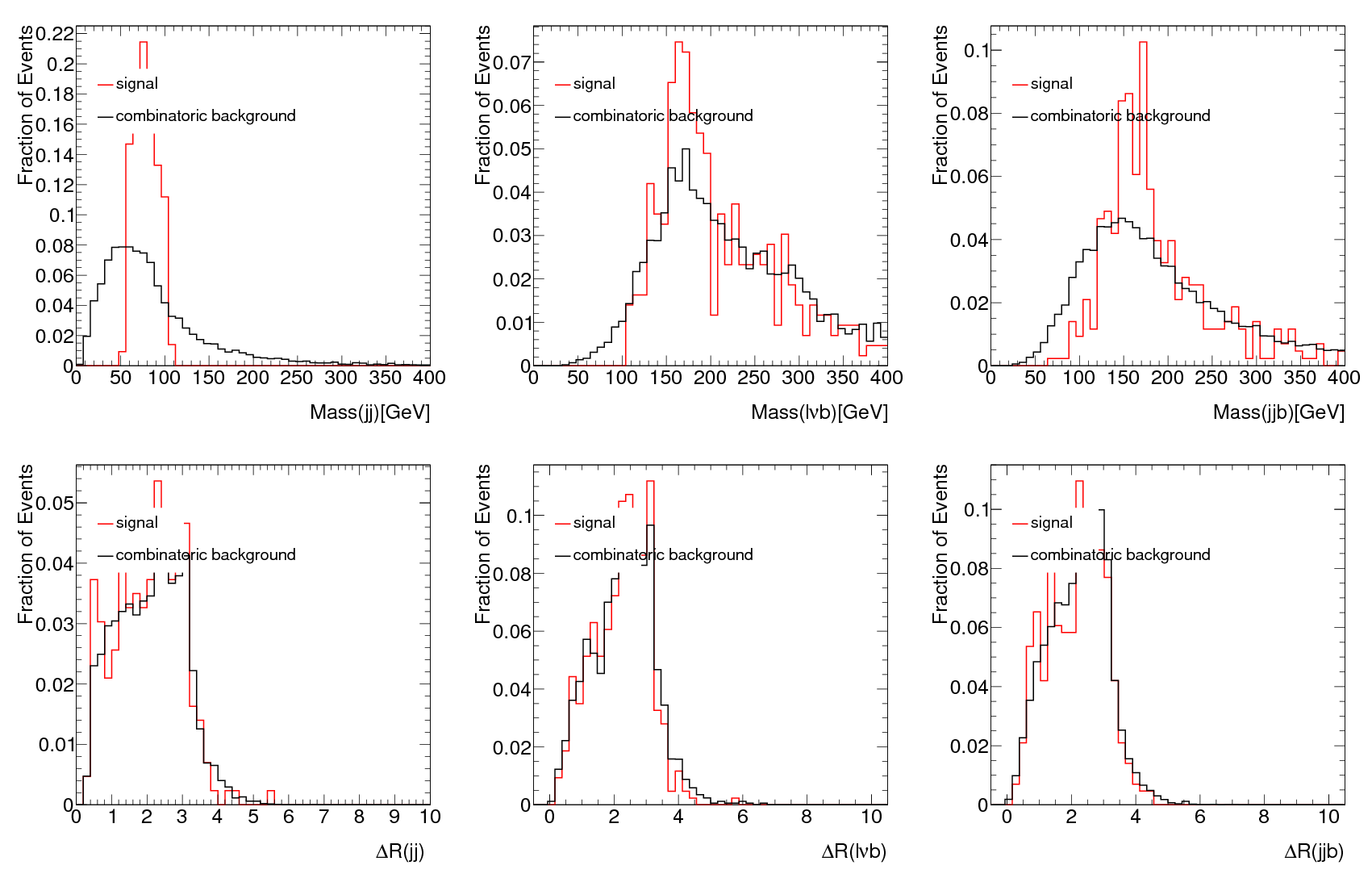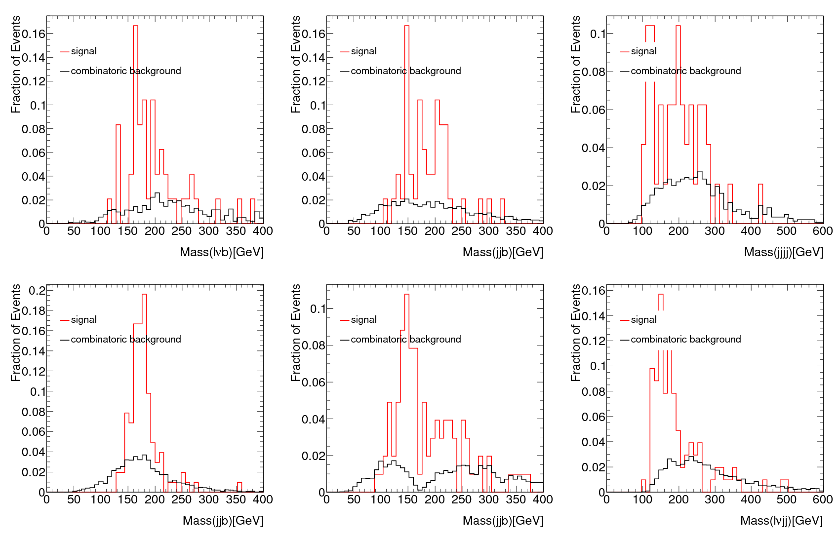 The reconstructed masses for the tops and Higgs for semi-leptonic top and semi-leptonic Higgs events (including identified signal and combinatoric background) are shown in Figure 9.