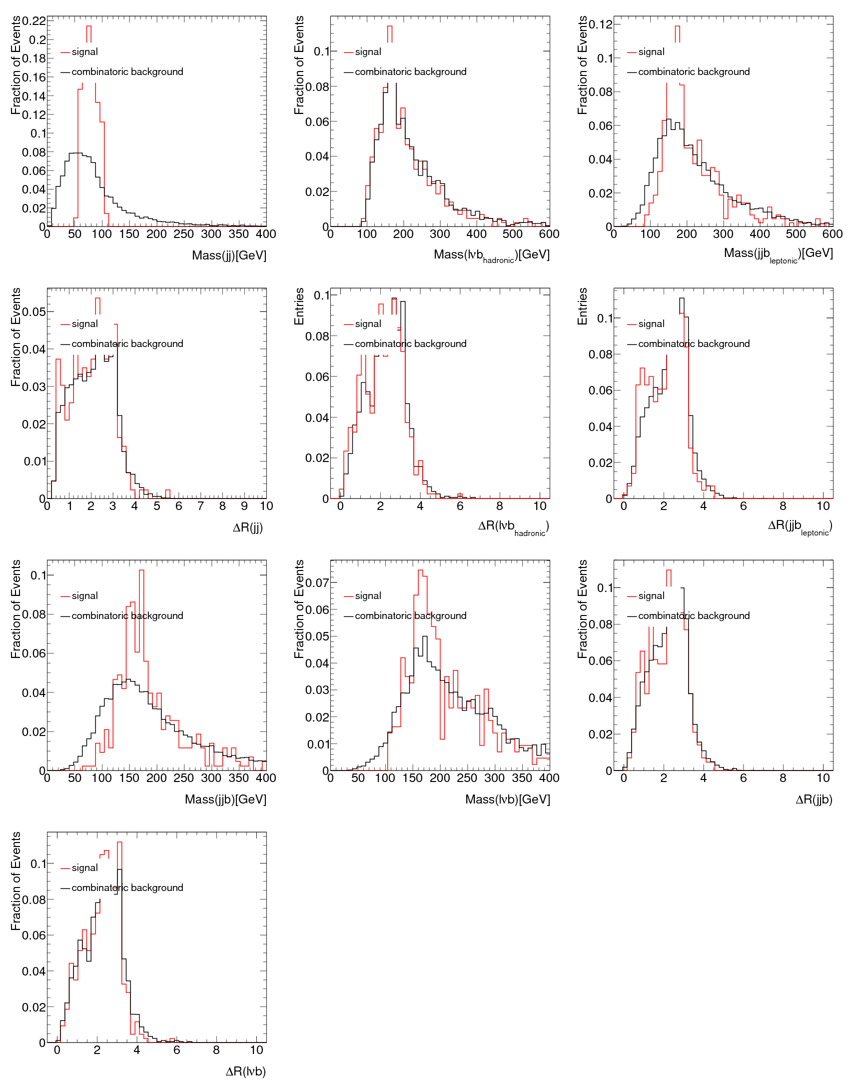 Figure 6: Discriminating variables used as input for BDT for semi-leptonic top events, showing identified signal and combinatoric background.