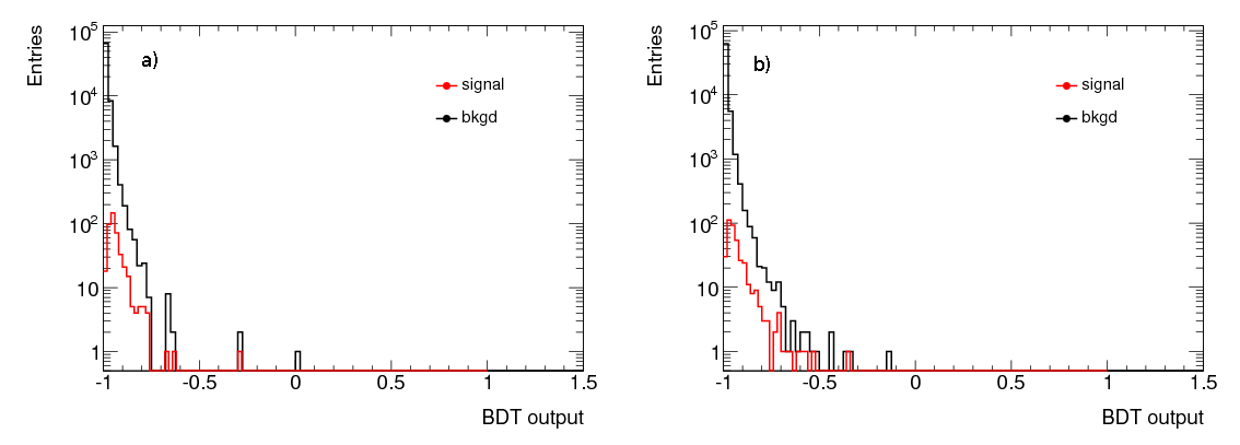 The TMVA implementation of the BDT is used [4]. Most variables are default athough a few are altered to avoid overtraining. The output of the BDT for signal and background is shown for semi-leptonic top events in Figure 8a) and for semi-leptonic Higgs events in Figure 8b)
