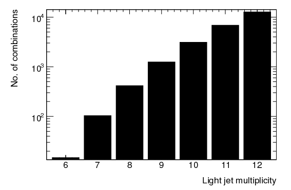 Due to limited statistics and desire to test (optimize) the effect of consideration of different numbers of light jets, the event reconstruction technique needed be able to deal with all numbers of light jets, from the threshold required by the event pre-selection to the total number of light jets in the event. Essentially this means the method must be able to deal with the large combinatorics that come from consideration of all possible unique pairings of \( n \) light jets to three hadronic W's. Depending on \( n \), the number of ways of pairing the light jets to the three hadronic W's is shown in Eqn. \eqref{eqn_ncomb} $$ \begin{equation} \ncomb = \frac{1}{6}\frac{n_{ljets}x(n_{ljets}-1)}{2}\frac{(n_{ljets}-2)x(n_{ljets}-3)}{2}\frac{(n_{ljets}-4)x(n_{ljets}-5)}{2} \label{eqn_ncomb} \end{equation} $$