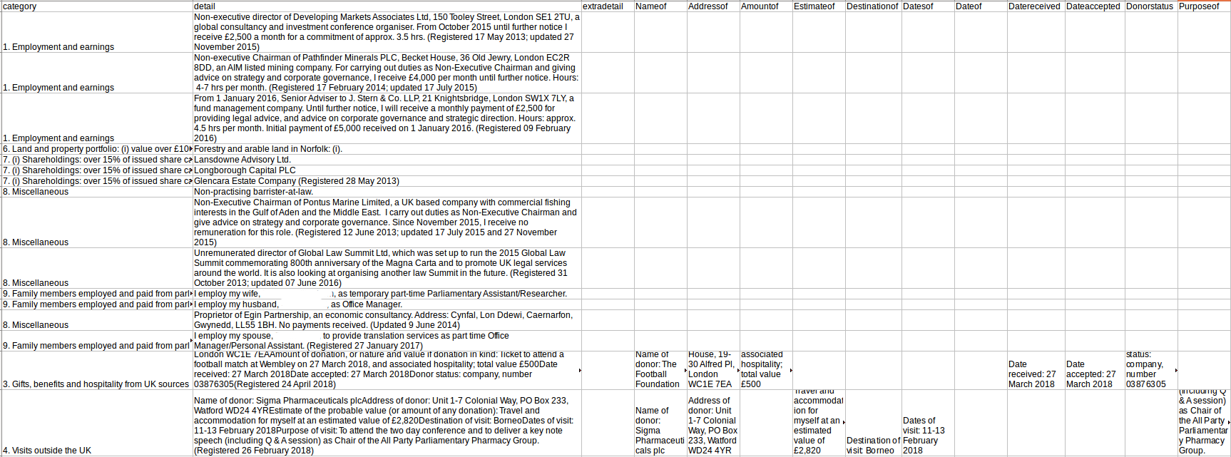 Summary. There is a wealth of information available on the internet. Web scraping is the process which enables people to collate and start to organise this data into a more structured format for further analysis. This project investigates this process using data provided by the UK Parliment, in particular the financial interests of members of the House of Commons. Attributes of the html data motivate the use of two Python libraries, Beautiful Soup and Scrapy, for this work.